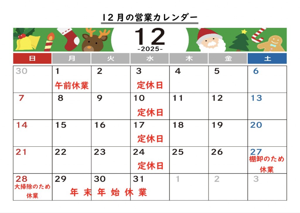 2025年12月営業日のお知らせ 2025年11月27日 【店舗お知らせ】 いつもご利用いただきありがとうございます! 12月の店舗営業カレンダーになります。 1日(月)は会議のため午前休業となります。12:30〜営業いたします。 27日(土)は棚卸しのため休業、28日(日)は大掃除のため休業になります。 29日(月)~1月3日(土)は年末年始休業となります。 ご不便をおかけしますが何卒よろしくお願いいたします。