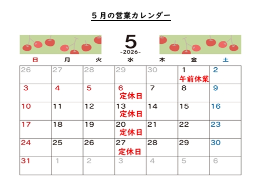 2026年5月 営業日のお知らせ 2026年04月19日 【店舗お知らせ】 いつもご利用いただきましてありがとうございます。 5月の店舗営業カレンダーです。 1日(金)は会議のため午前休業とさせていただきます。12:30〜営業いたします。